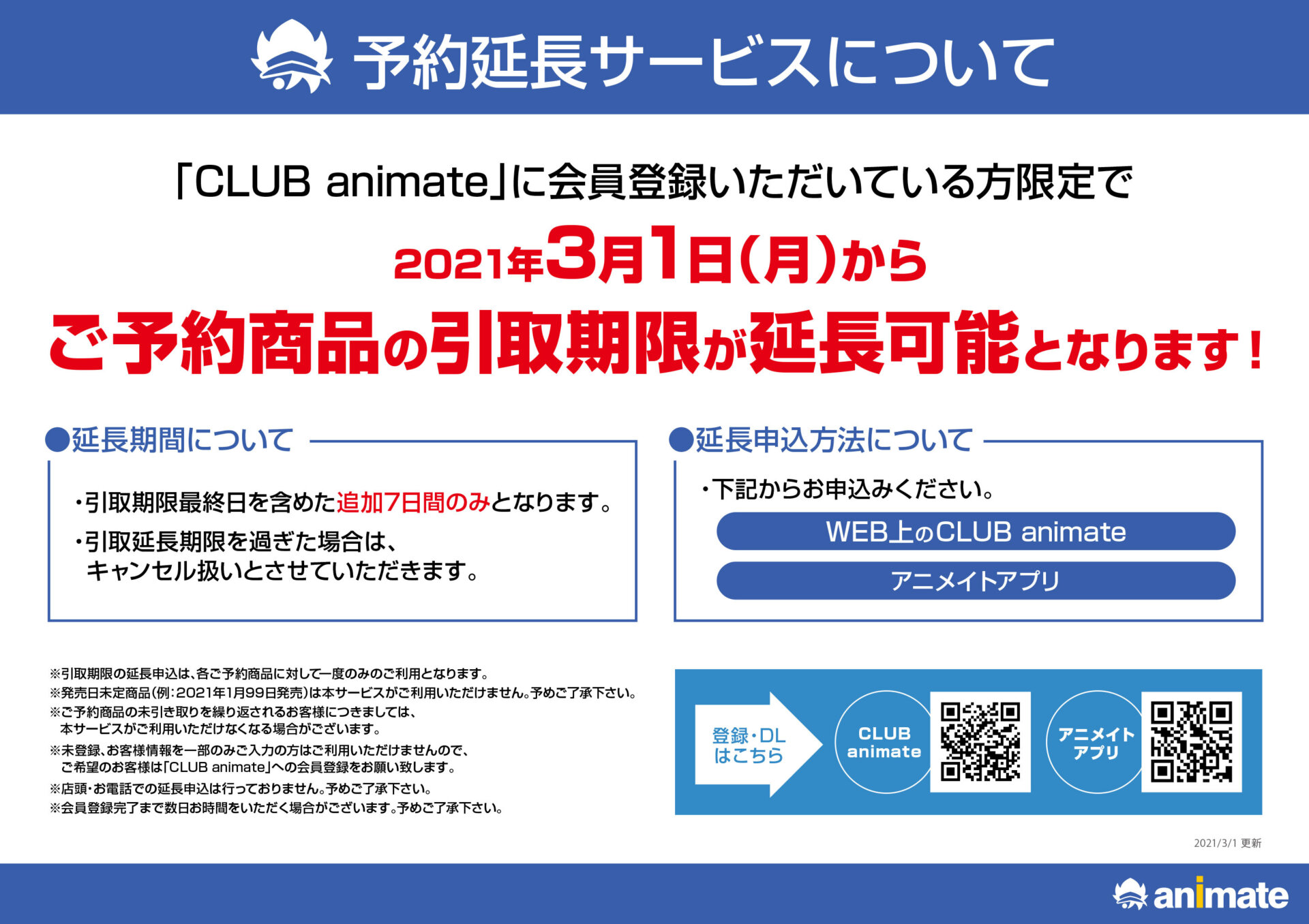 アニメイトをご利用いただき、誠にありがとうございます。2021年3月1日(月)より、「CLUB animate」と「アニメイトアプリ」上でご予約商品の取り置き期間の延長サービスを開始しております。https://www.animate.co.jp/info/383466/■サービス開始日 2021年3月1日(月)■対象 全国アニメイト店舗・ACOS●ご予約商品の予約延長サービスは「CLUB ani...