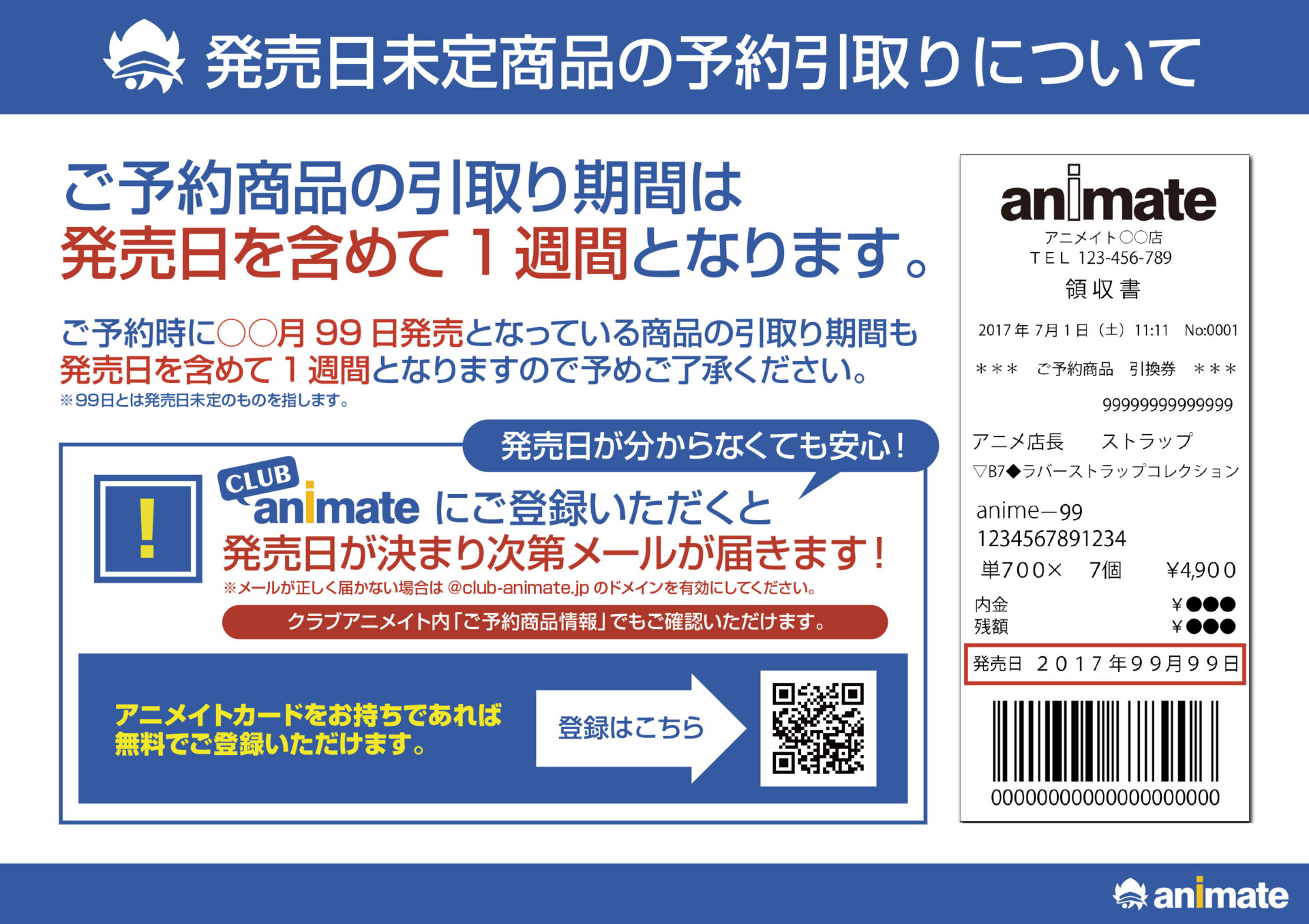 ★★「発売日未定(発売日○○月99日表記)」商品のご予約引き取りについて★★平素よりアニメイト、クラブアニメイトをご利用いただき、誠にありがとうございます。「発売日未定(発売日○○月99日表記)」商品の予約引き取り期間につきまして、【商品入荷日を含めて1週間】とさせていただいております。誠におそれ入りますが、お客様へ個別にご予約商品の入荷・発売延期・中止の連絡を行なっていない為、HP、店頭告知、情...