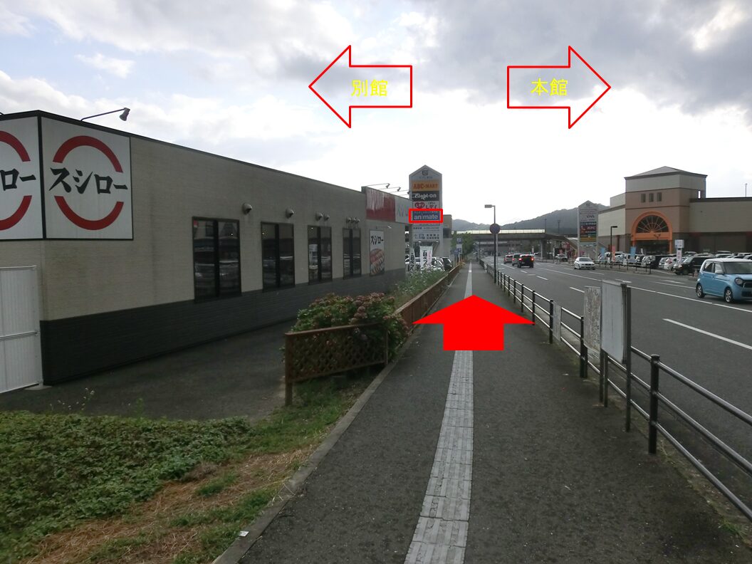 到达寿司郎后,沿着它的右侧直行,前往animate所在的富士广场东广岛附馆。 看板上有我们的店标!