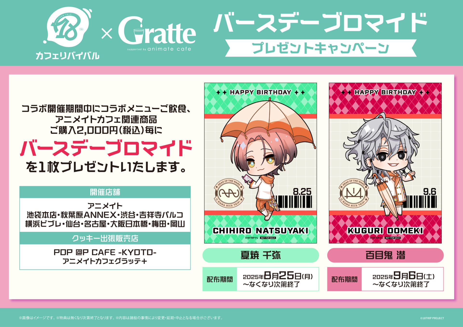コラボ開催期間中にコラボメニューご飲食、アニメイトカフェ関連商品ご購入2,000円(税込)毎に