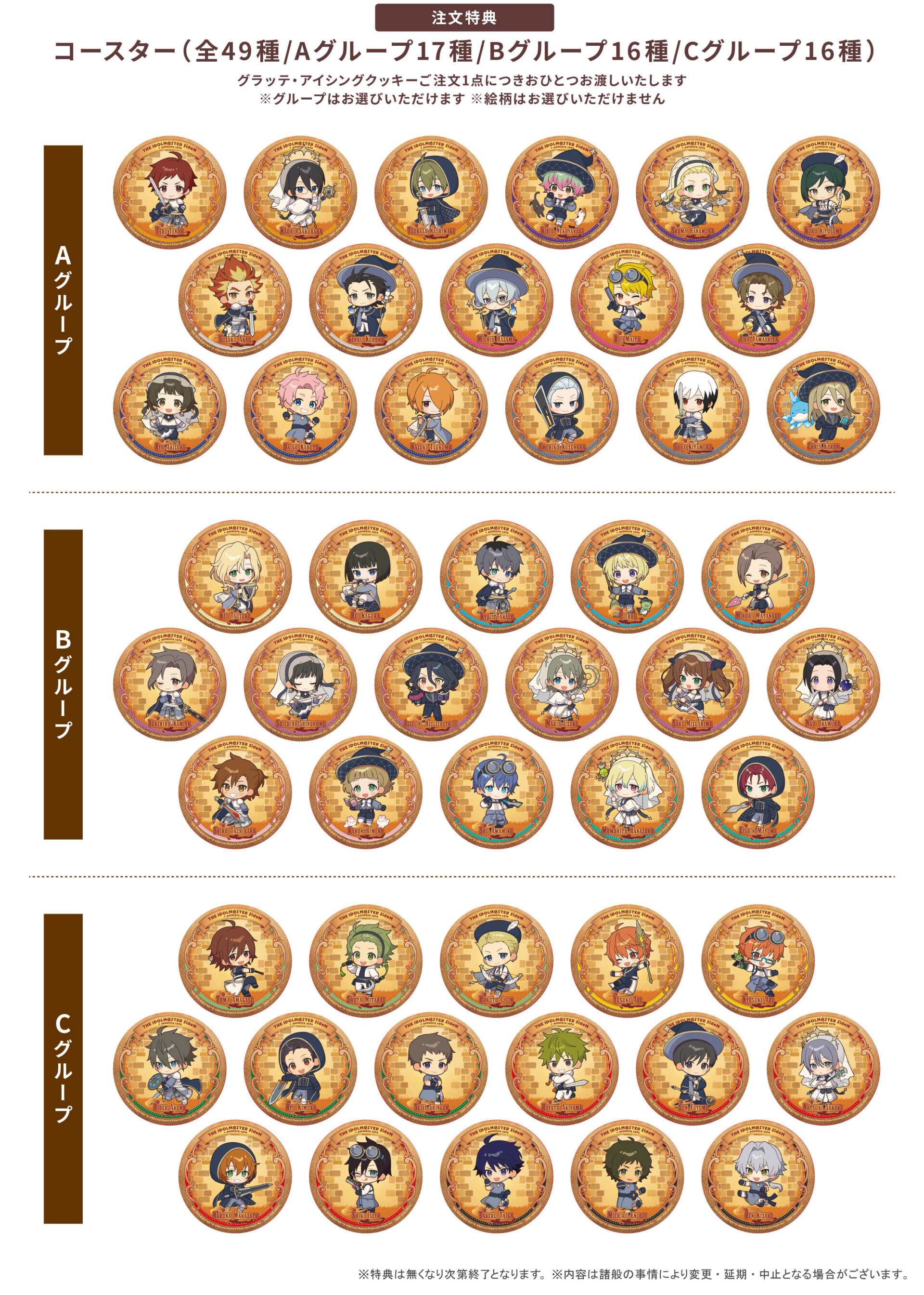 特典:コースター(全49種/Aグループ17種/Bグループ16種/Cグループ16種)