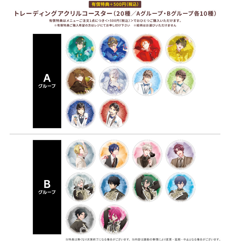 有償特典:トレーディングアクリルコースター(Aグループ 全12種/Bグループ 全11種)