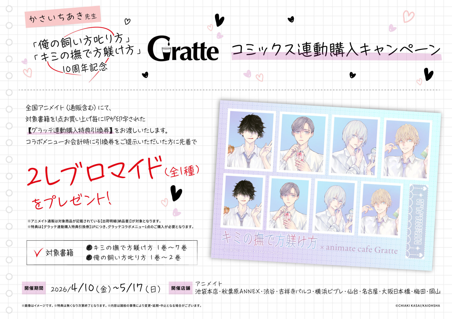 全国アニメイト(通販含む)にて、対象書籍をお買い上げ毎に「グラッテ連動購入特典引換券」をお渡しいたします。