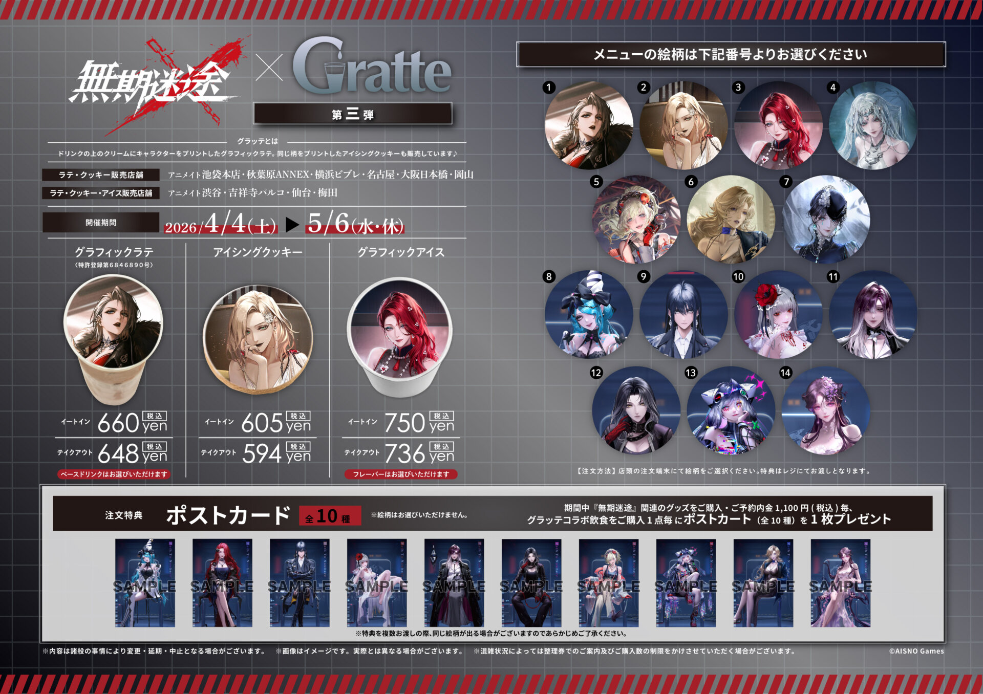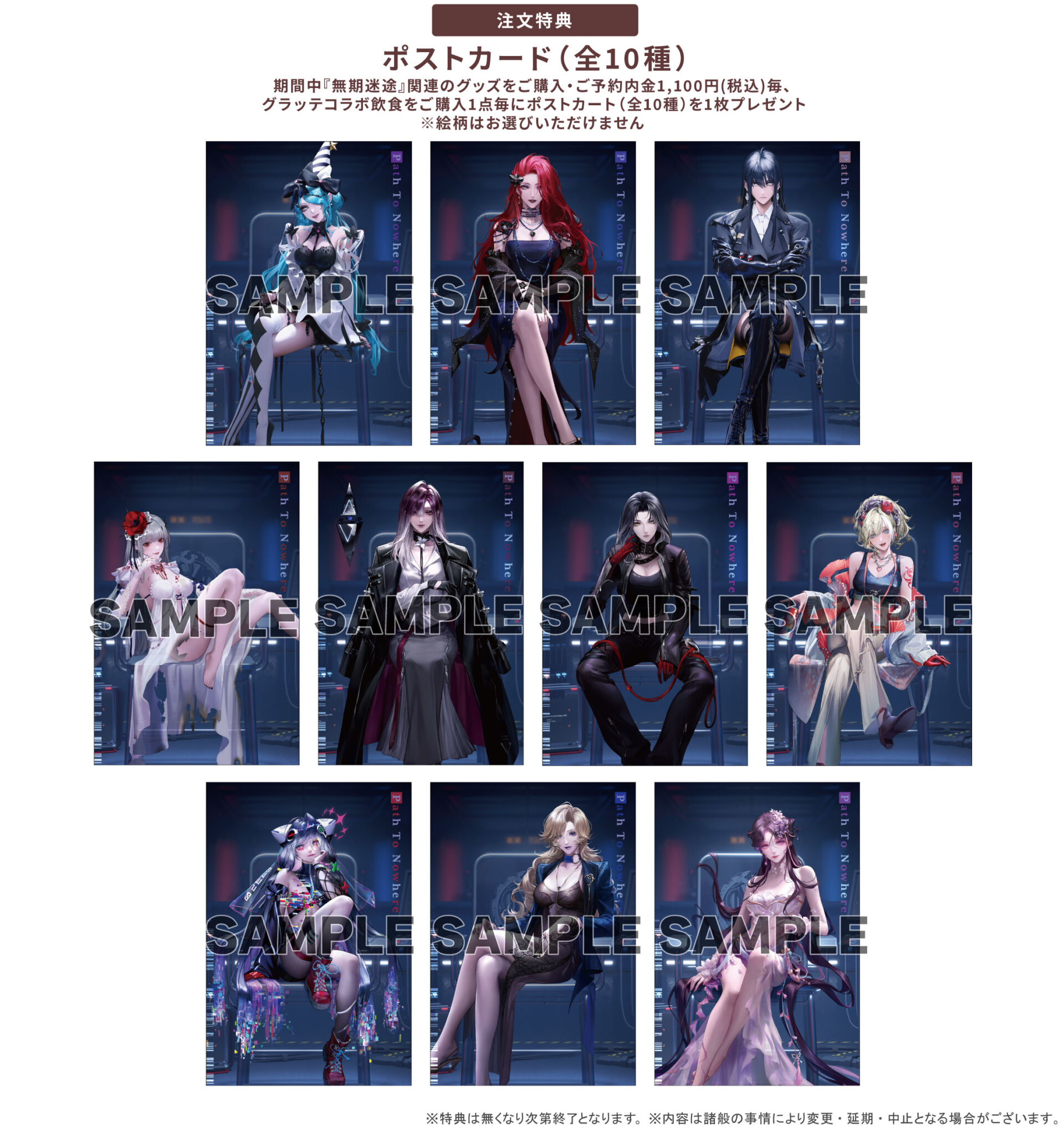 期間中『無期迷途』関連のグッズをご購入・ご予約内金1,100円(税込)毎、 グラッテ飲食をご購入1点毎にポストカード(全10種)を1枚プレゼント