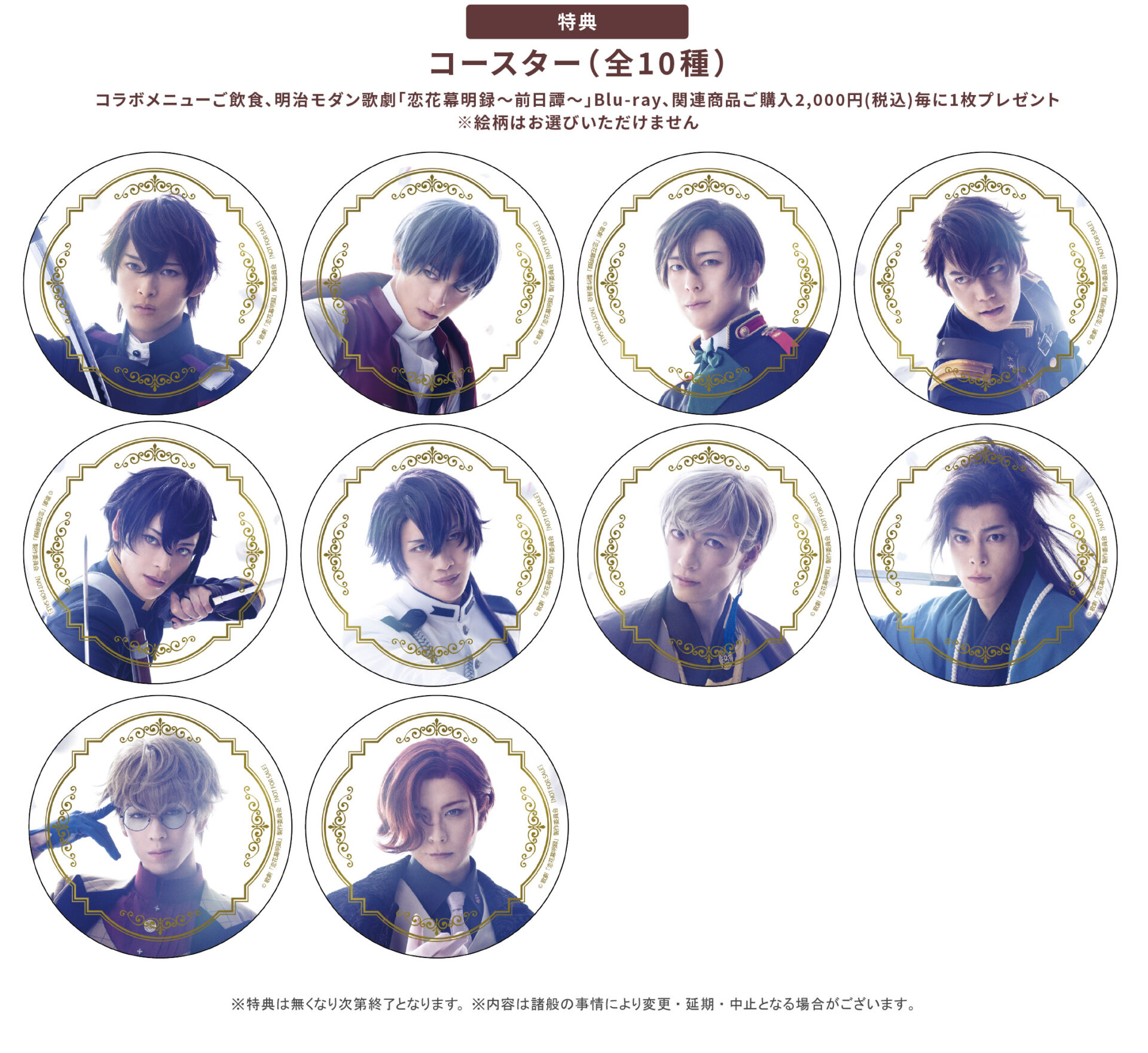 コラボメニューご飲食、明治モダン歌劇「恋花幕明録~前日譚~」Blu-ray、関連商品ご購入2,000円(税込)毎に<コースター(全10種)>をランダムで1枚プレゼント。