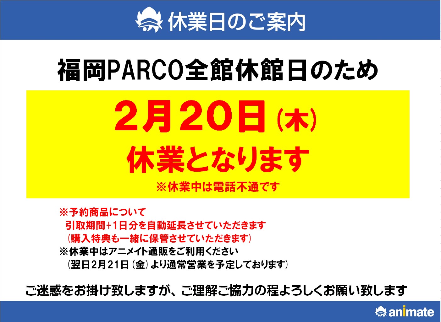 福岡PARCO全館休館日の為、2月20日(木)は休業となります