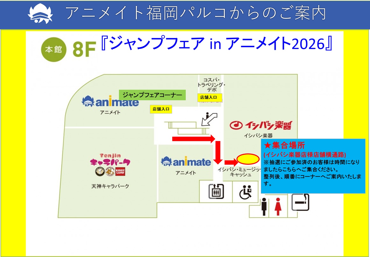 開店時間以降に本館8Fイシバシ楽器店様横通路に各時間帯の待機列の形成を行いますので、