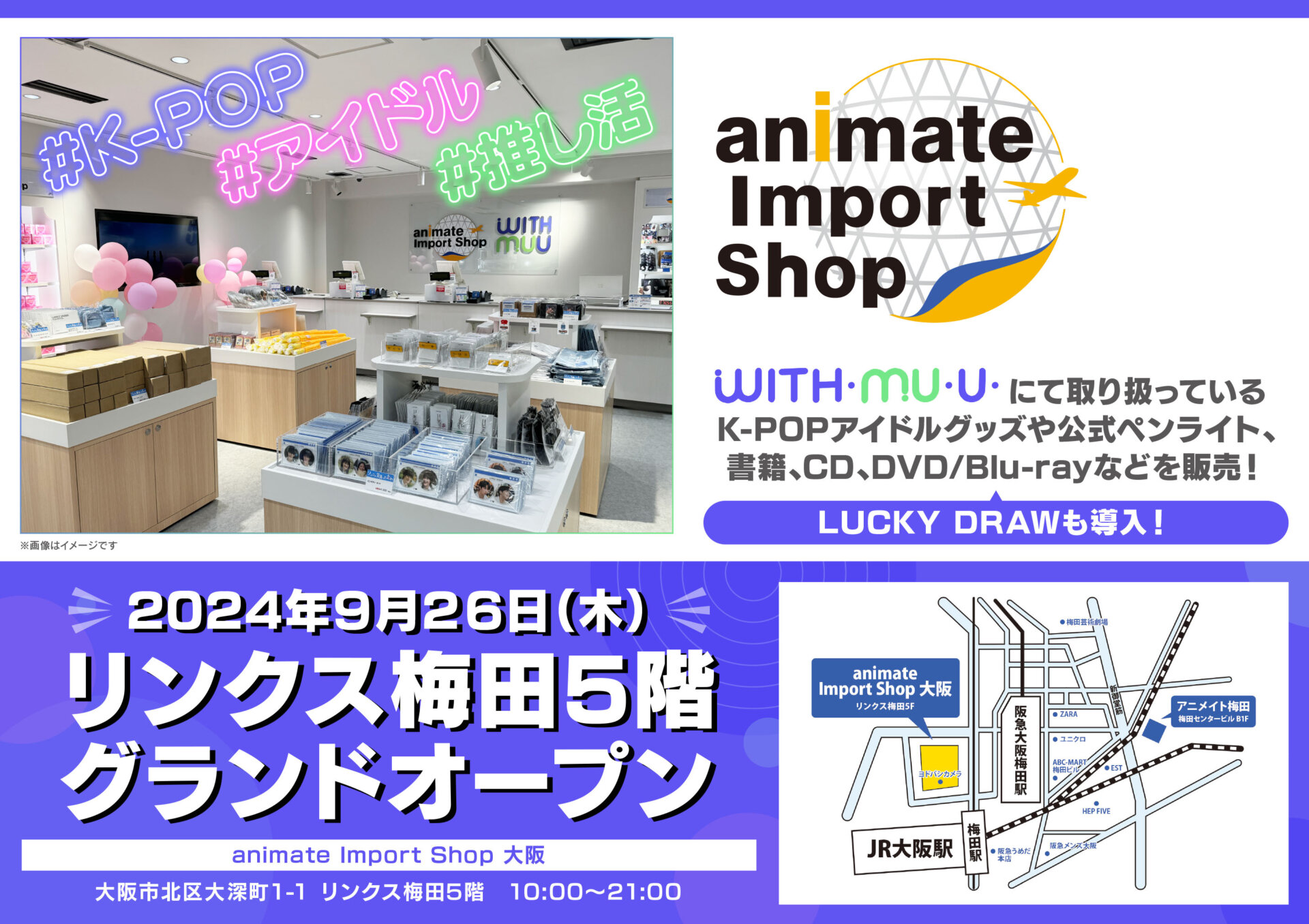 株式会社アニメイトは、2024年9月26日にK-POPアイドルのCDやグッズが手に入るショップ「animate Import Shop 大阪」を、大阪・梅田にあるリンクス梅田 5階にオープンいたします。
