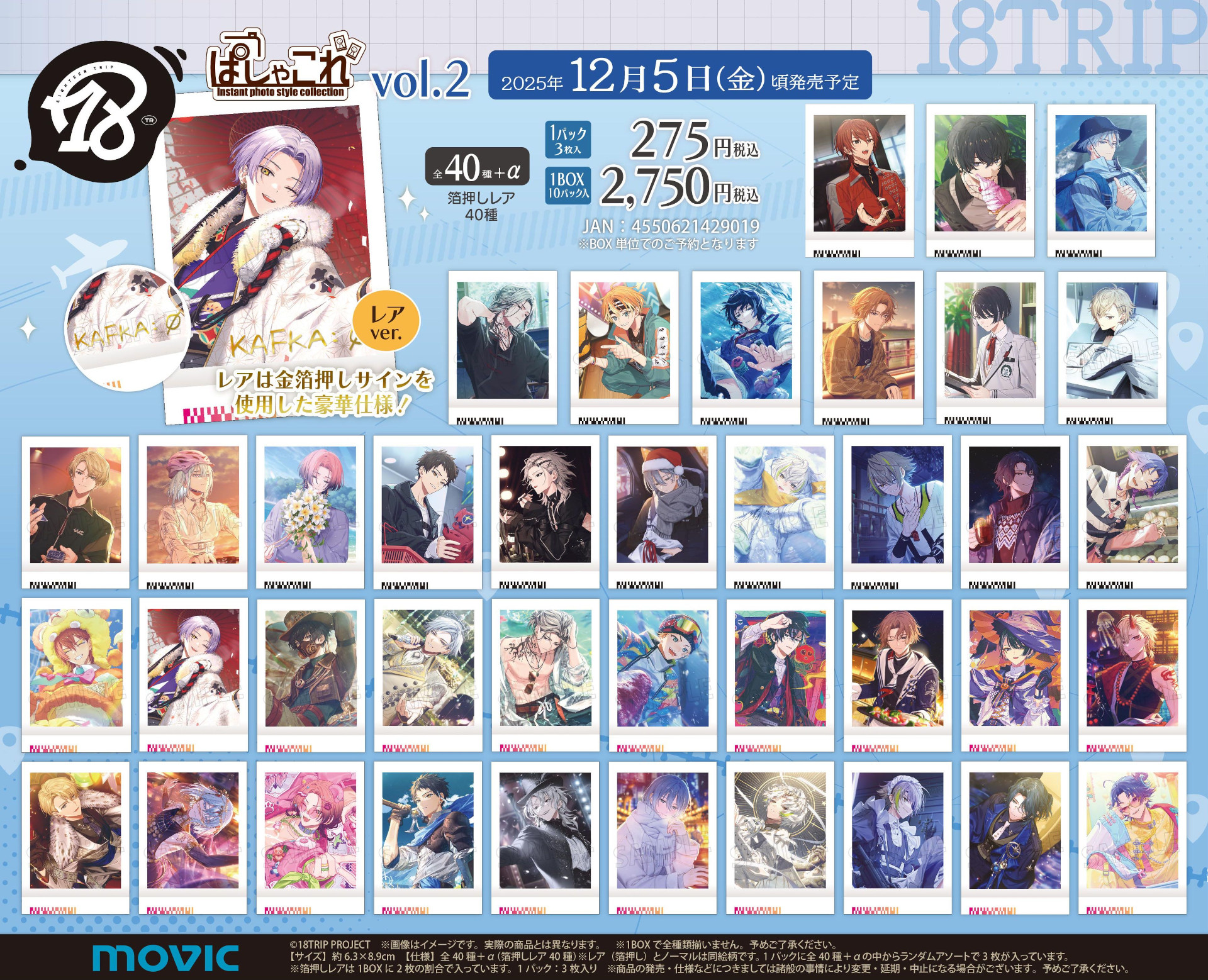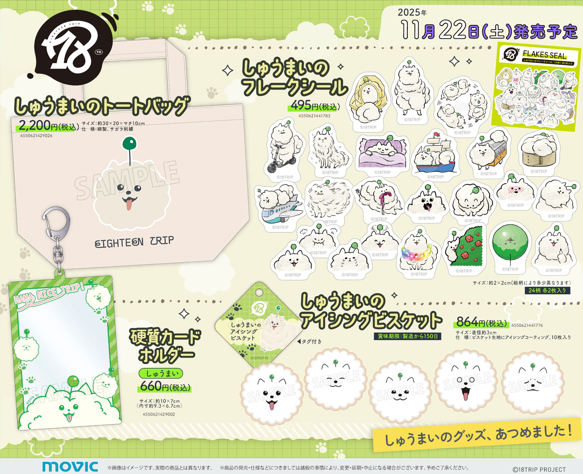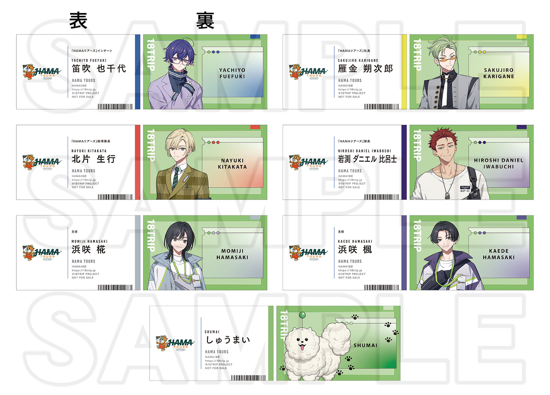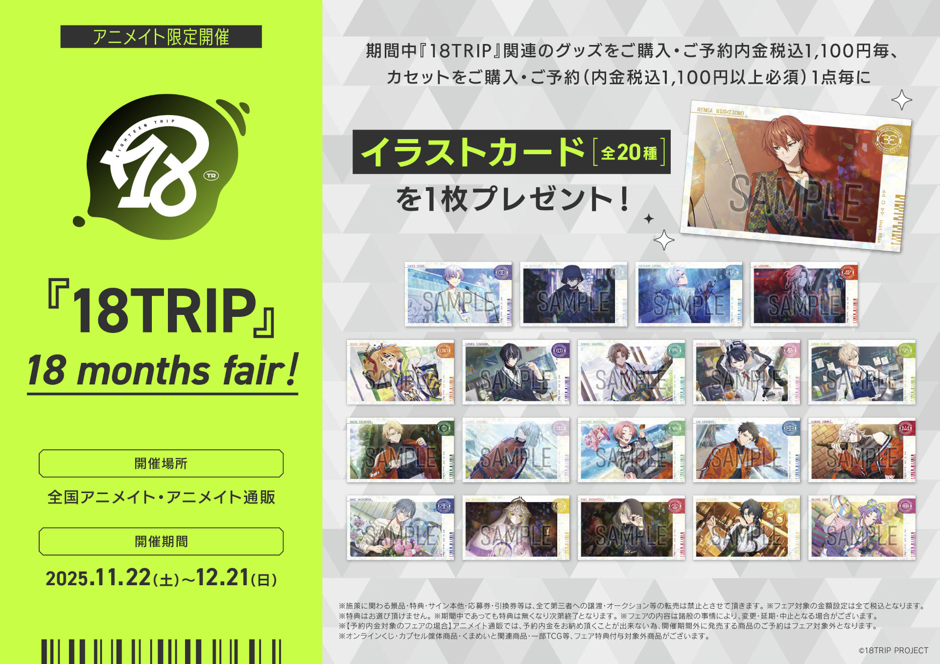 期間中、開催店舗にて『18TRIP』関連のキャラクターグッズをご購入1,100円(税込)毎に【社員証風カード(全7種)】を1枚プレゼント! ※特典はお選びいただけません。
