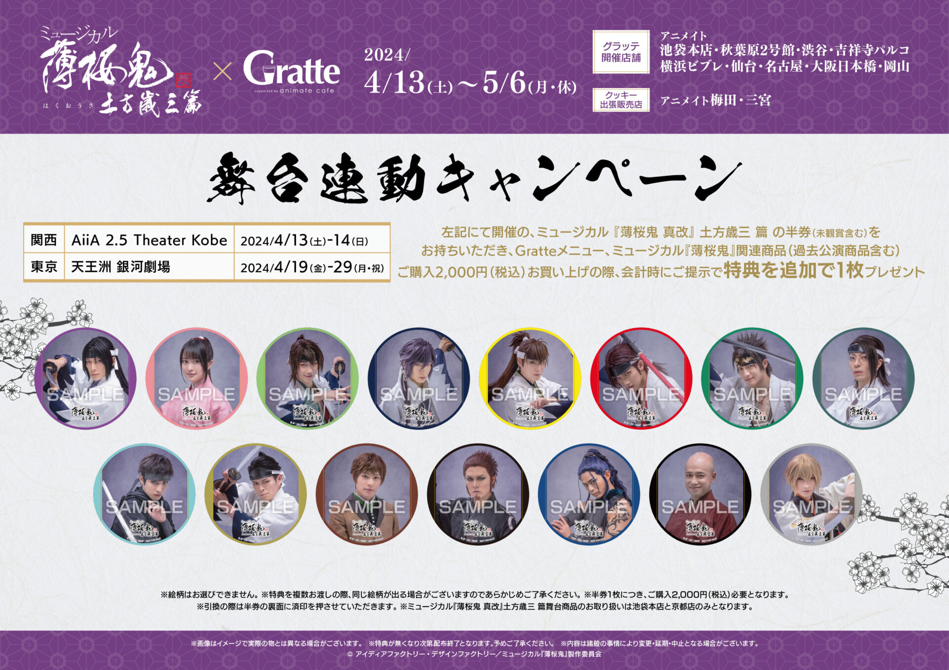 コラボメニューご飲食、ミュージカル『薄桜鬼』関連商品(過去公演商品含む)ご購入2,000円(税込)お買い上げの際、会計時にご提示で特典を追加で1枚プレゼント!