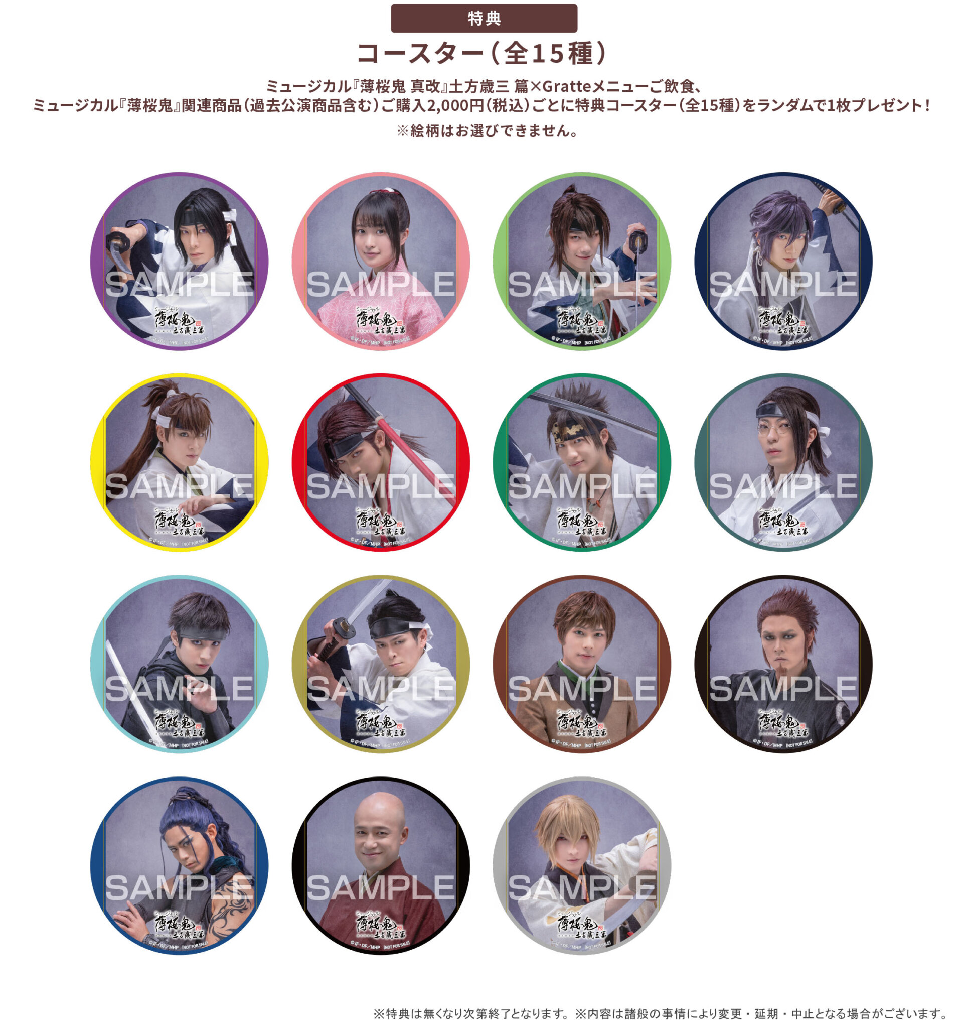 コラボメニューご飲食、関連商品(過去公演商品含む)ご購入2,000円(税込)毎に<コースター(全15種)>をランダムで1枚プレゼント。
